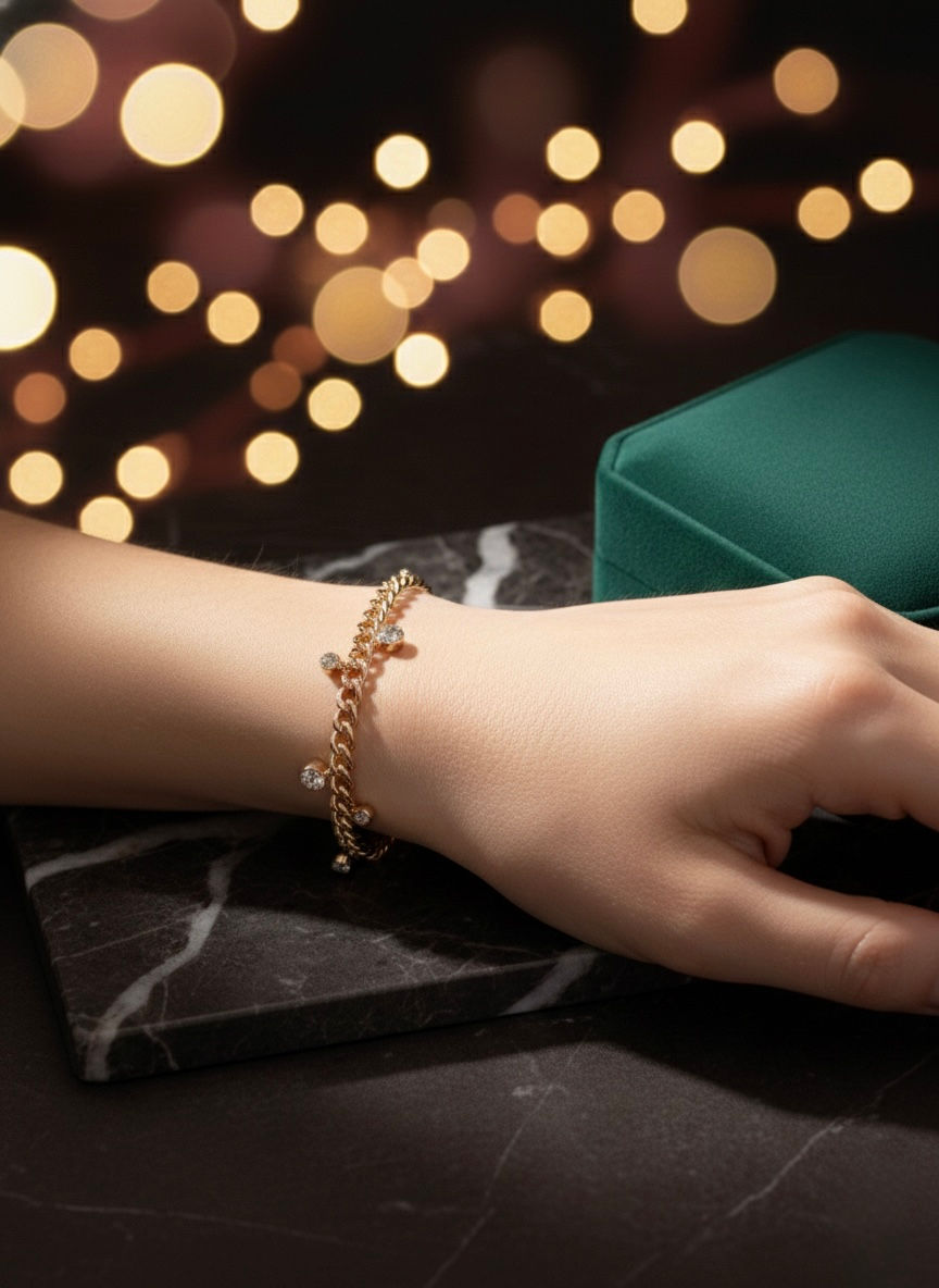Elevate your elegance with our Dazzle Chain Bracelet, meticulously crafted from premium stainless steel material to ensure long-lasting beauty. This stunning piece is rose gold plated, delivering a luxurious sheen that perfectly complements any outfit. Designed with your comfort in mind, the bracelet is skin safe and features an anti-tarnish finish for timeless wear. Experience the blend of sophistication and durability that Lavish Jewellery stands for, adding a touch of refined charm to your collection.