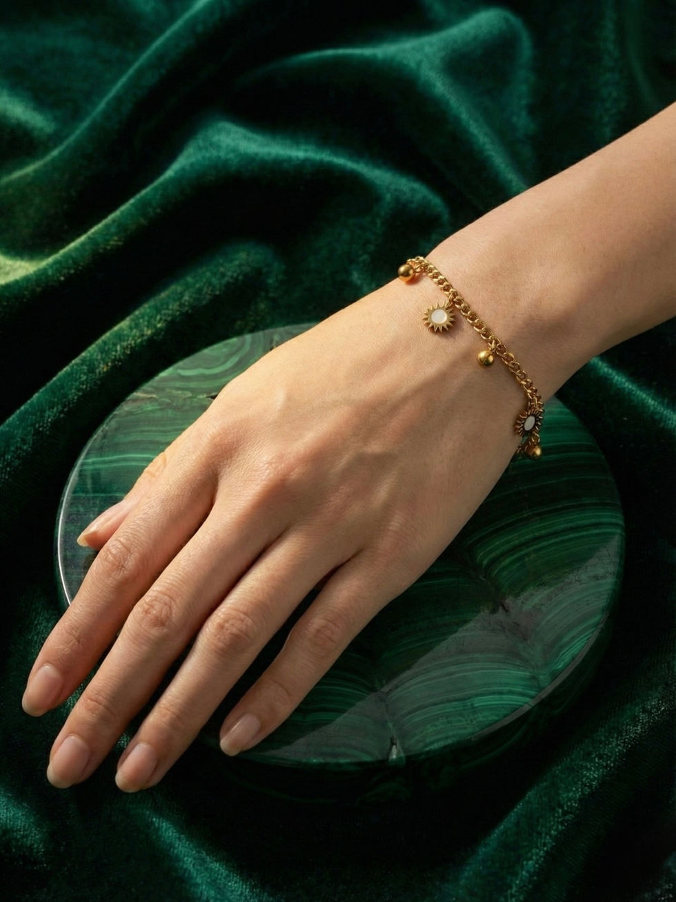 Elevate your elegance with the Golden Sunshine Charms Bracelet from Lavish Jewellery. Crafted from premium stainless steel material and exquisitely gold plated, this stunning piece ensures lasting shine and durability. Our commitment to quality means the bracelet is anti-tarnish and skin safe, making it perfect for everyday wear. Adorn your wrist with a timeless accessory that reflects sophistication and grace. Indulge in the artistry and craftsmanship that defines Lavish Jewellery.